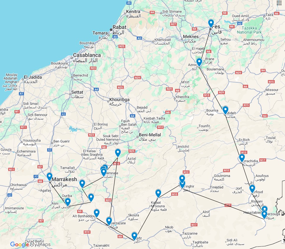 Vols: AT931 / AT440 (aller) • LX2201 (retour) · Itinéraire: Fès → Azrou/Ifrane → Midelt/Errachidia → Merzouga → Todra/Dadès → Drâa (Agdz/Zagora) → Ouarzazate → Marrakech.